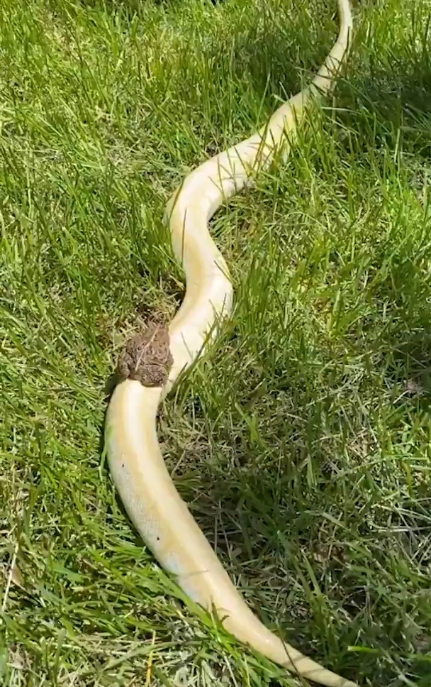 下面這隻蟾蜍的操作就在網上火了起來,牠讓蟒蛇馱著自己在草地上緩緩移動,如同人類在遊戲中體驗新的坐騎(點圖放大瀏覽):