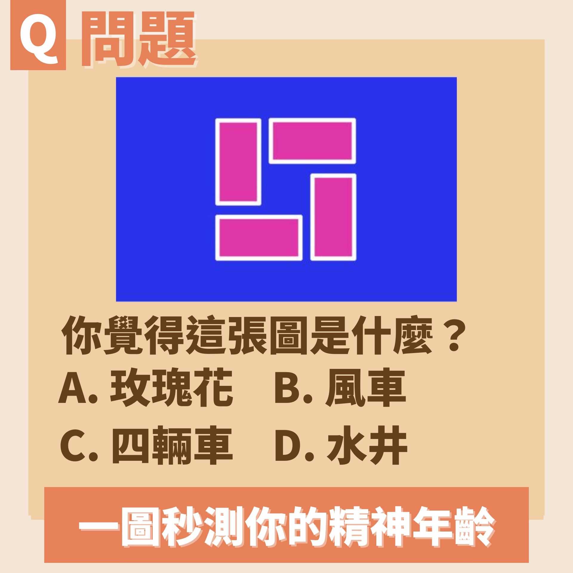 日本網站《shinri》近日分享一道題目,並表示「你的精神年齡是年輕還是成熟?即使是成年了,仍保有一顆男孩或女孩的心嗎?」可以透過此題目,測出自己的「精神年齡」。