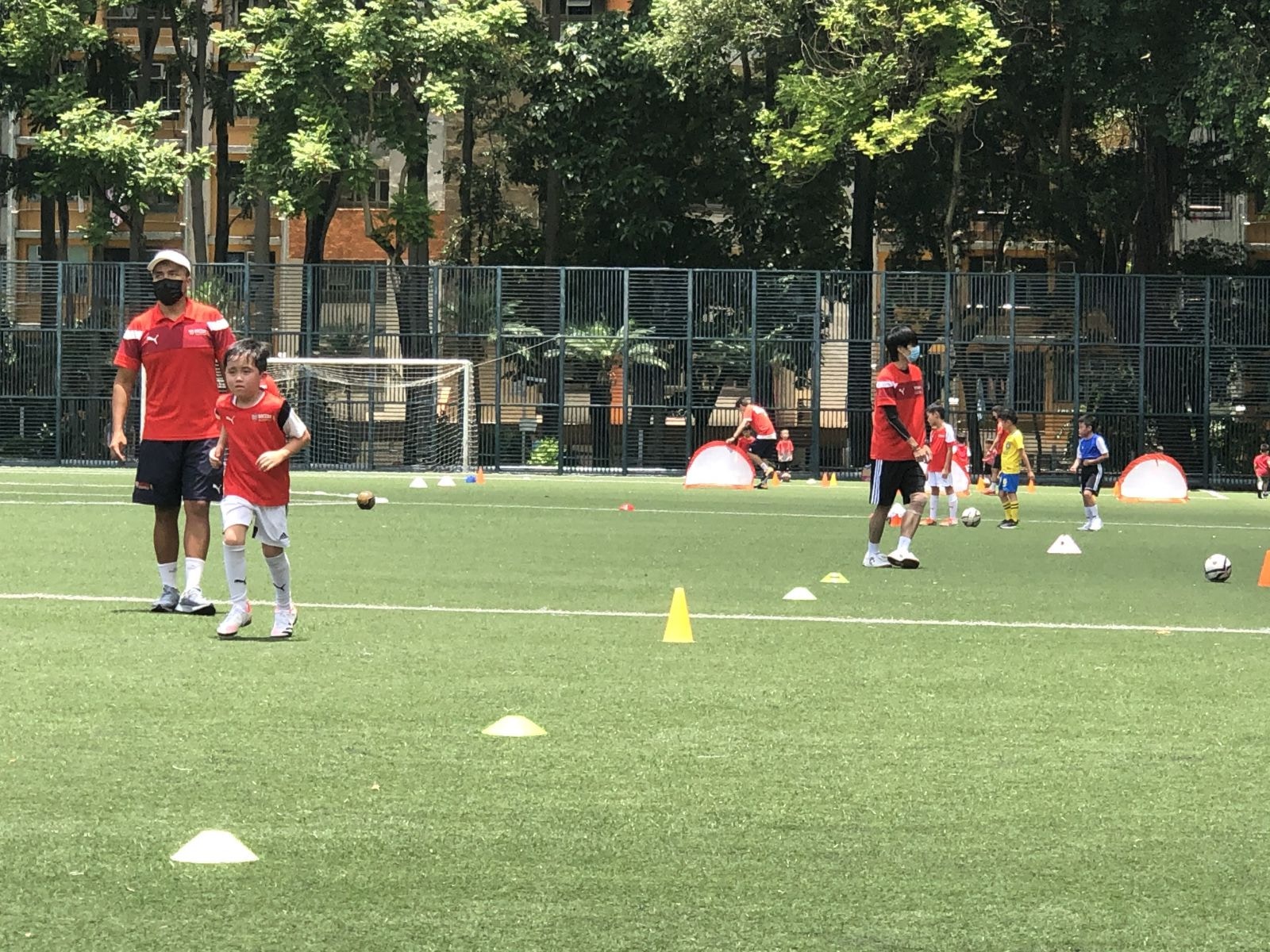 與朋友在公園打籃球的許先生表示,今天的人流明顯比平日少,他們來之前籃球場更沒有人使用。為應對疫情,他們表示更會戴着口罩打籃球,直到太熱支撐不住才除下來。而足球埸方面,則只有已預約的興趣班在教波,而教練和助教等都戴上口罩訓練,其他球場則只有零星市民在跑步。
