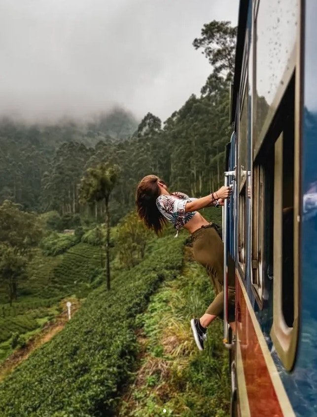 由於途中有許多美麗山景與森林,當火車行經巴杜勒(Badulla)與哈利埃拉(Hali Ela)站之間路線時,她把身體伸出車外自拍。