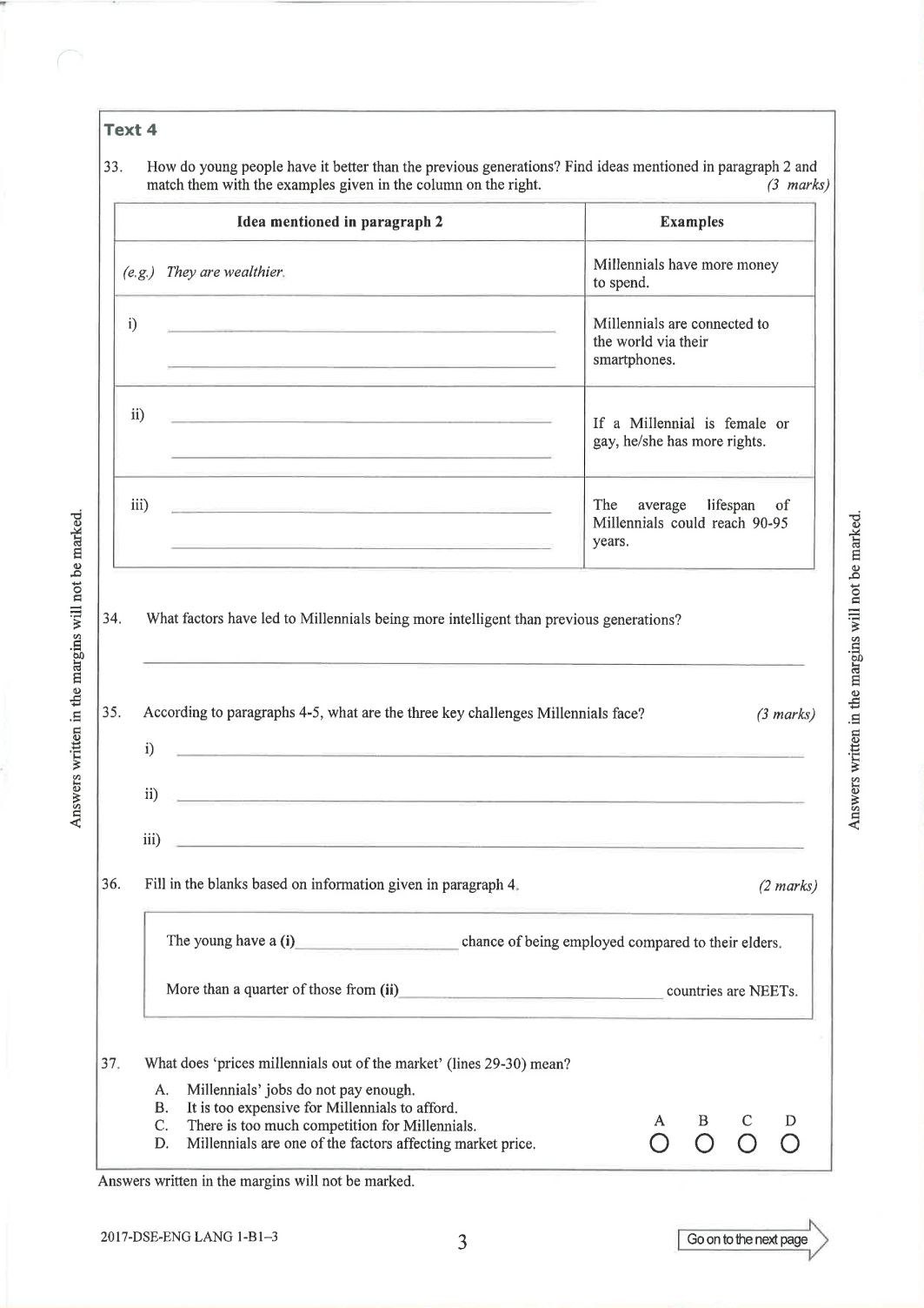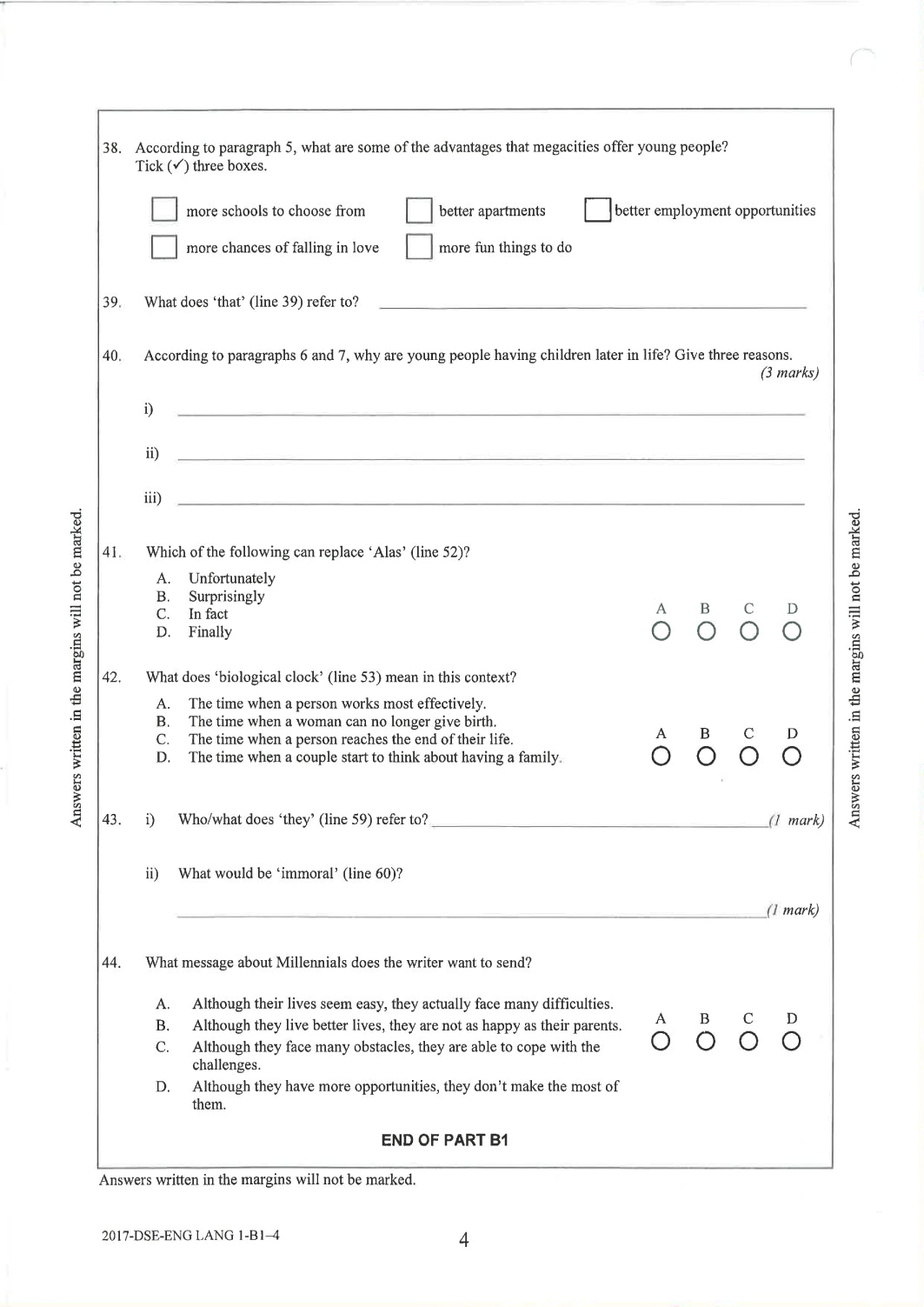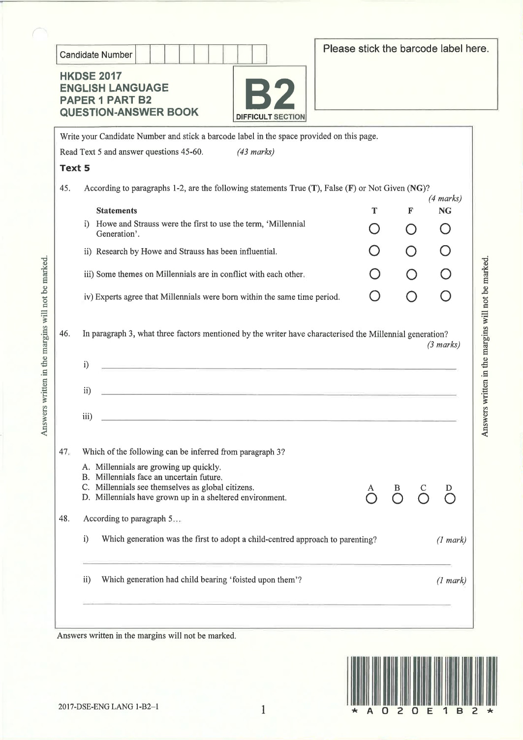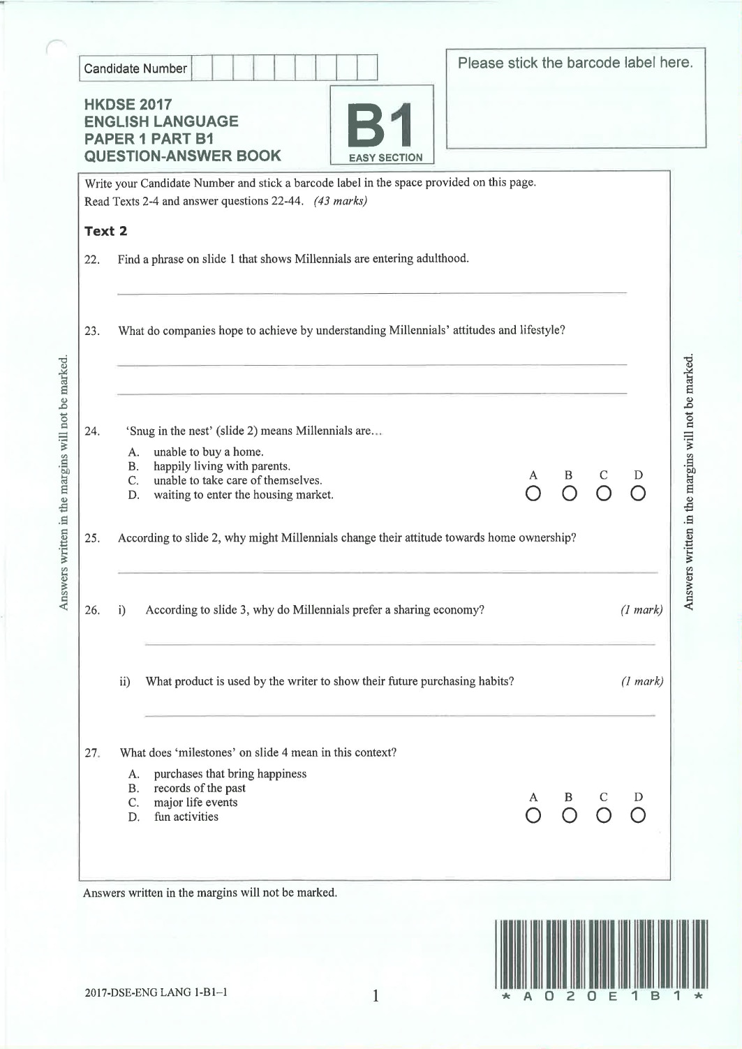 英文科Paper 1(閱讀理解)Part B1 Question-Answer Book