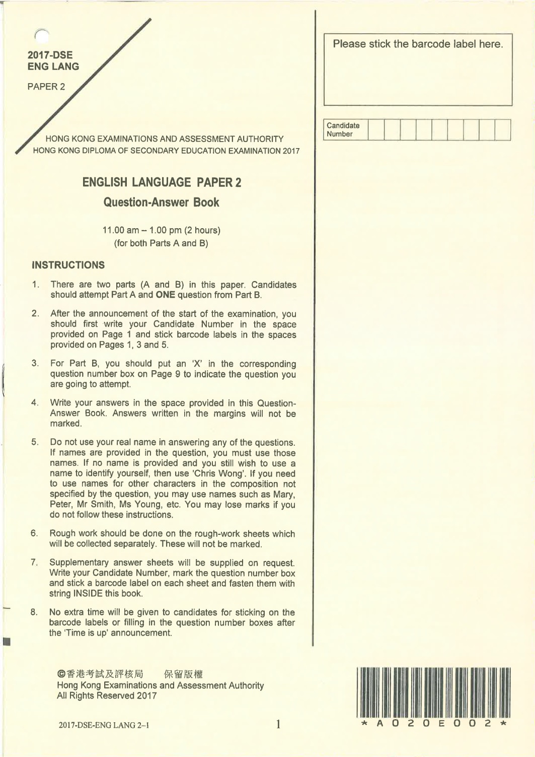英文科Paper 2(作文)Question-Answer Book